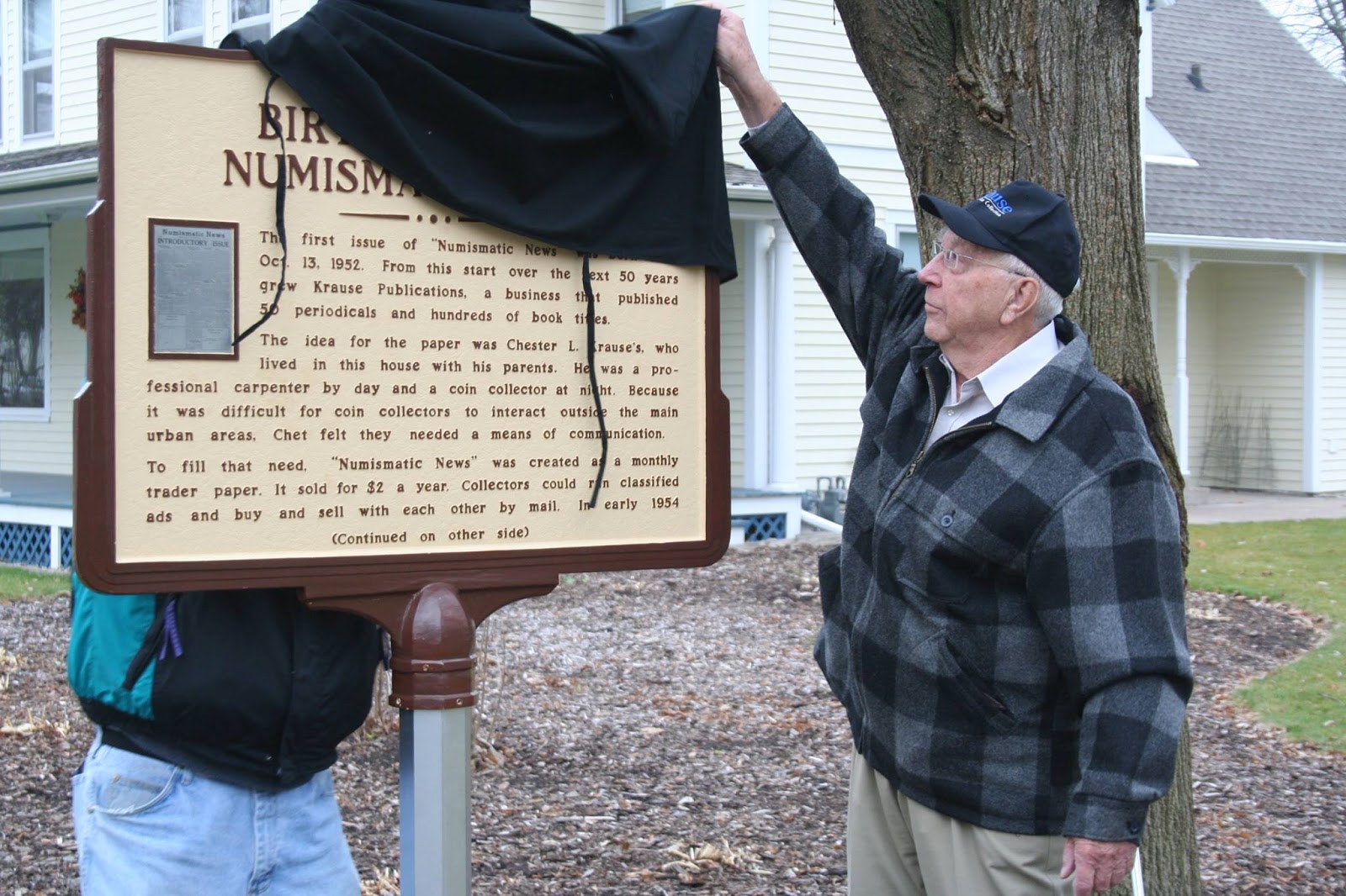 | Krause at the historical marker unveiling outside his home (Credit: Iola Historical Society) |