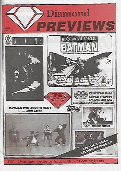 But while Batman-logo items would be ubiquitous in shops of all kinds several weeks after the film's release (including record stores, thanks to separate soundtracks from Prince and Danny Elfman), comics retailers disproportionately benefited from the film early on thanks to a strong buildup of product beforehand in the Direct Market. Diamond Comic Distributors' Previews #118 (April 1989, for June-shipping material) dedicated a five-page special section just to Batman merchandise. A lot of it had existed previously and so was connected only to the character, but a significant amount was movie-related.