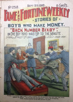 But while some bound-together editions of comic books exist, comic books were not generally considered candidates for binding by many libraries — ironic, of course, given today's market for collected editions. Comic books, as discussed in my companion essay on numbering's origin, likely took their preference for whole numbers from dime novels, most of which really cost a nickel and which likewise weren't considered of interest to many librarians. Rather, these serialized fiction magazines — precursors to pulps — found that whole numbers offered a cue that helped readers to know what they'd already read. If you'd just read Back Number Bixby's adventures in Fame and Fortune Weekly #258 in 1910, you'd assume that #259 was next.