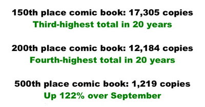 Notable, however, was the performance of titles in the midsection of the charts. The 150th place title shipped 17,305 copies, the third largest amount at that level in 20 years. The 200th place title sold 12,184 copies, the fourth highest amount in two decades. The 50th, 100th, 400th, and 500th place titles all hit one-year highs. While in part due to more releases on offer after a year in which publishers had cut their slates back, it appears that, in the absence of a blockbuster title for the month, retailers may have spread their ordering dollars around to other issues. October's total comics shipment of 8 million copies was the largest since May 2017, which had the 25¢ Saga #43 padding the totals.